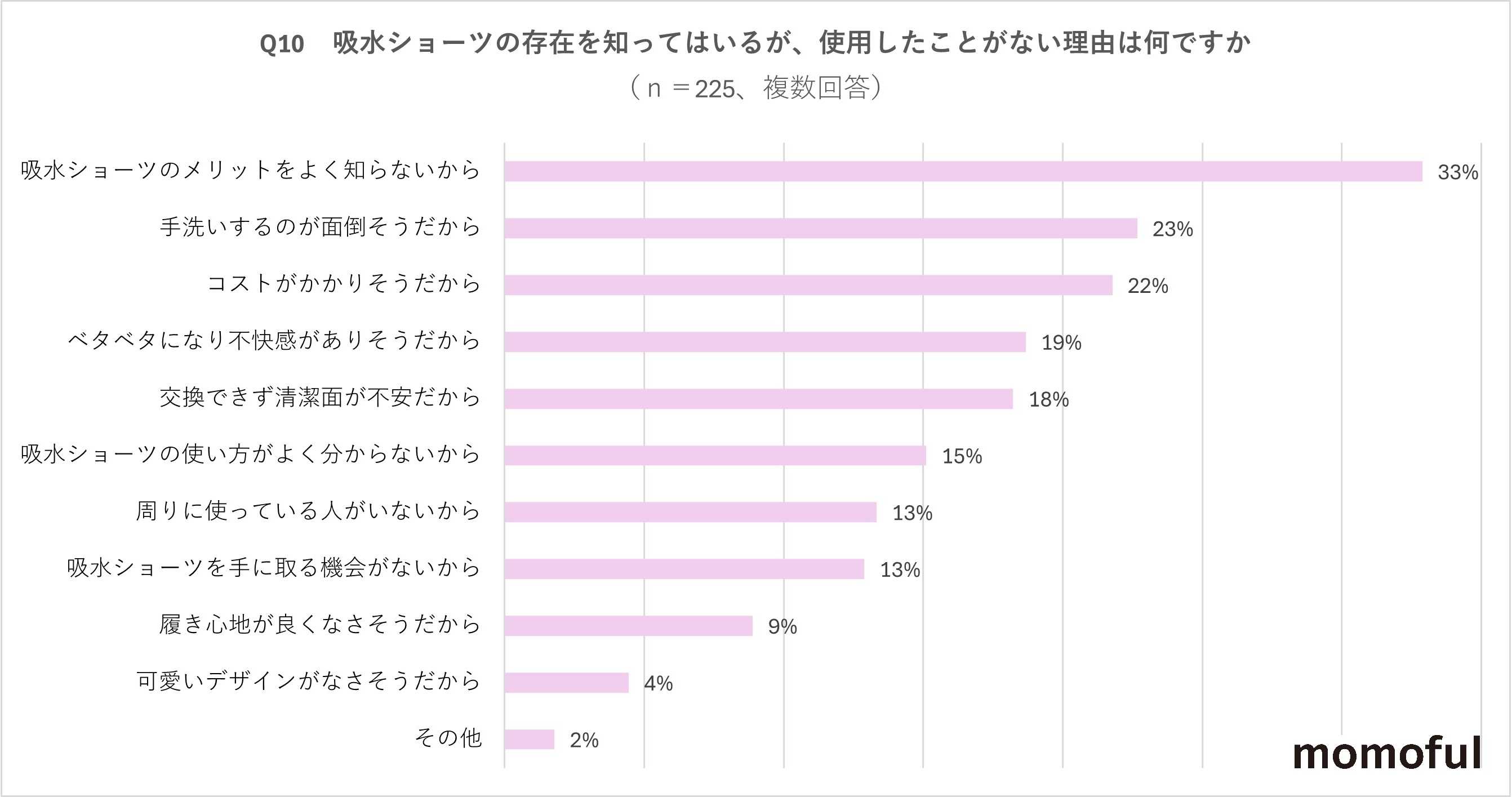 吸水ショーツの存在を知っていても使用経験がない理由は「メリットをよく知らない」(33%)が最多。具体的には「手洗いが面倒そう」(23%)「コストがかかりそう」(22%)「ベタつきそう」(19%)「衛生面が不安」(18%)といった回答が挙がっており、実際の使用体験をイメージできていないことがうかがえます。
