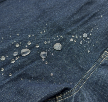 ※) ※一般的なデニムは10.0oz程度(283.5g/M2)に対して撥水デニムは6.7oz(190g/M2)