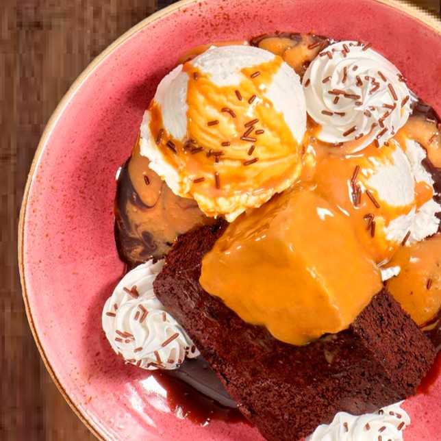 スペインやラテンアメリカが起源の「ドルチェ・デ・レチェ」にチョコレートソース、アイスクリーム、ホイップクリームをトッピングしたブラウニー。