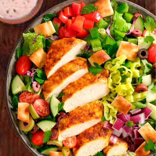 ロメインレタス、キュウリ、ブラックオリーブ、トマト、パプリカなどをレッドワインシーザードレッシングで和え、ケイジャンチキンをトッピング。