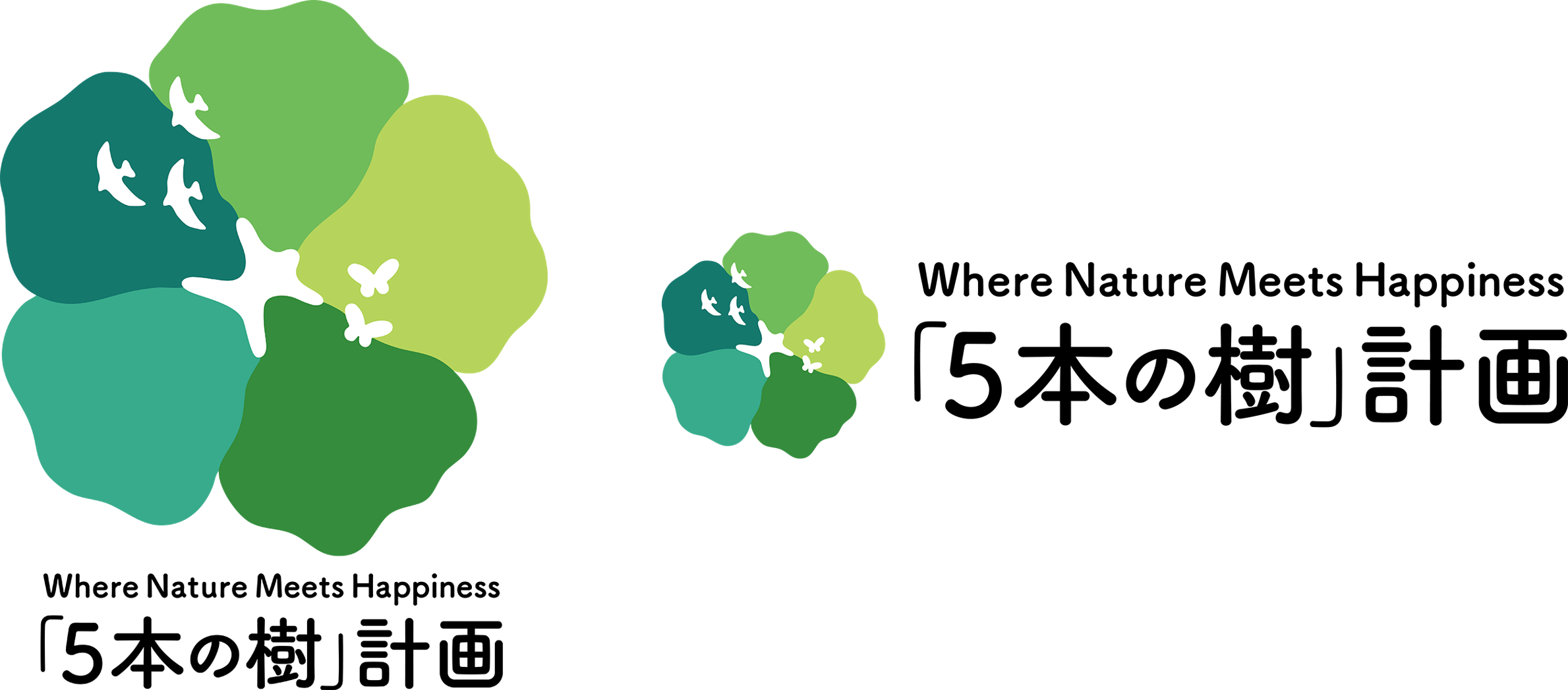私たちはこのグローバルビジョンを実現していく象徴として、新たに「5本の樹」計画のロゴを制作しました。このロゴには、木を植えるという行為が本来もつ“幸せを広げる力”を表現しています。木を植えることは、鳥や昆虫などの生きものにとって幸せな行為であり、地域社会にとっても、国にとっても、そして地球全体にとっても幸せをもたらします。その積み重ねは、やがてそこで暮らす人々の幸せへと巡り返っていきます。