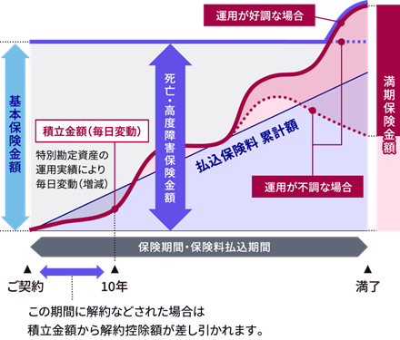 - この保険は積立金額、払いもどし金額および満期保険金額などが特別勘定資産の運用実績に応じて変動(増減)するしくみの変額保険です。