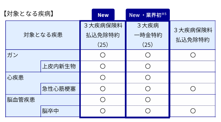今般、お客さまの多様なニーズにお応えするため、従来の3大疾病に加えて、上皮内新生物・脳血管疾患・心疾患に罹患し、所定の状態となった場合にも保険料の払込みを免除する「3大疾病保険料払込免除特約(25)」を発売します。