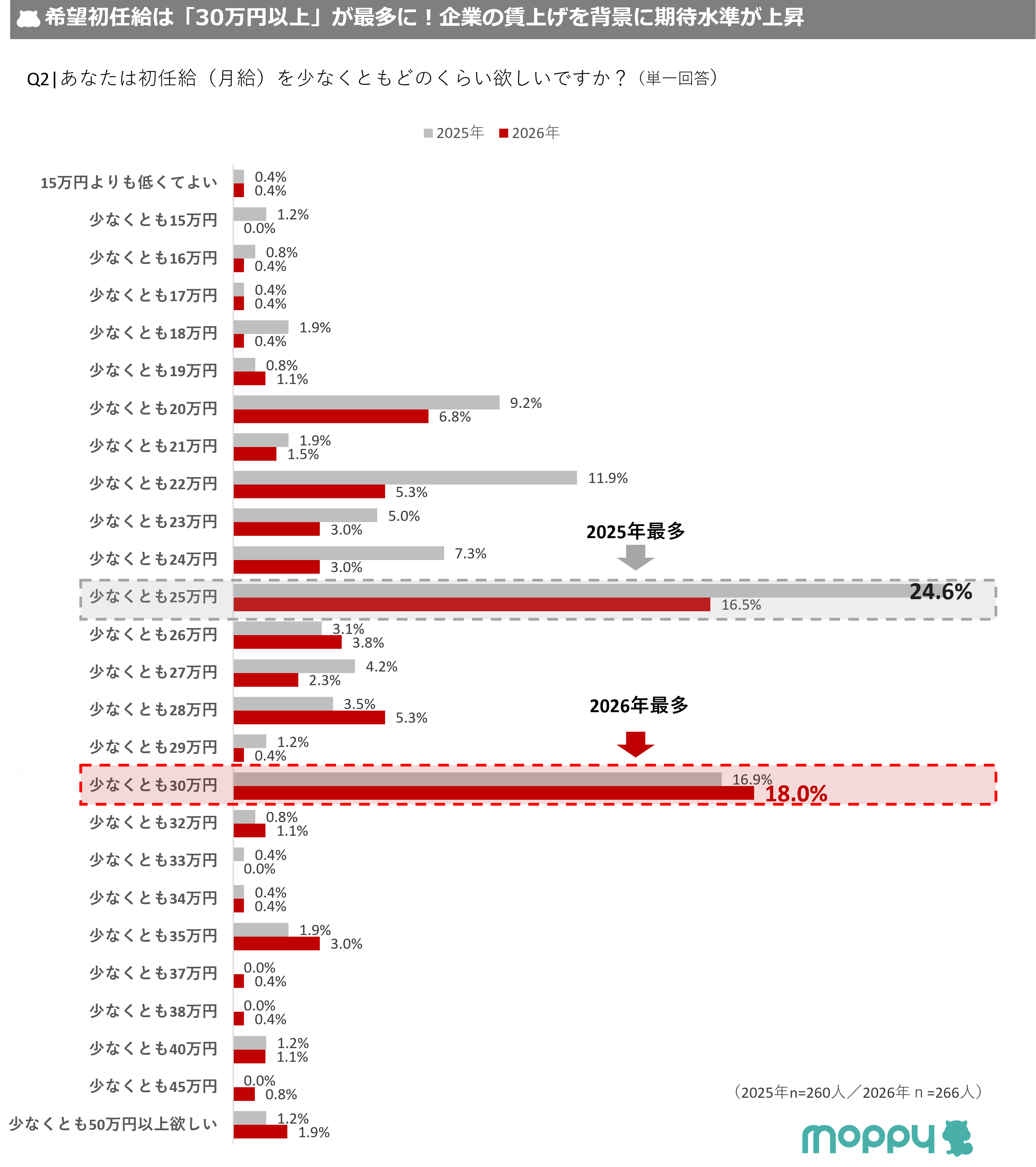 初任給の希望額について尋ねたところ、前年は「少なくとも25万円(24.6%)」が最多だったのに対して、2026年は「少なくとも30万(18.0%)」が最も多い結果となりました。
