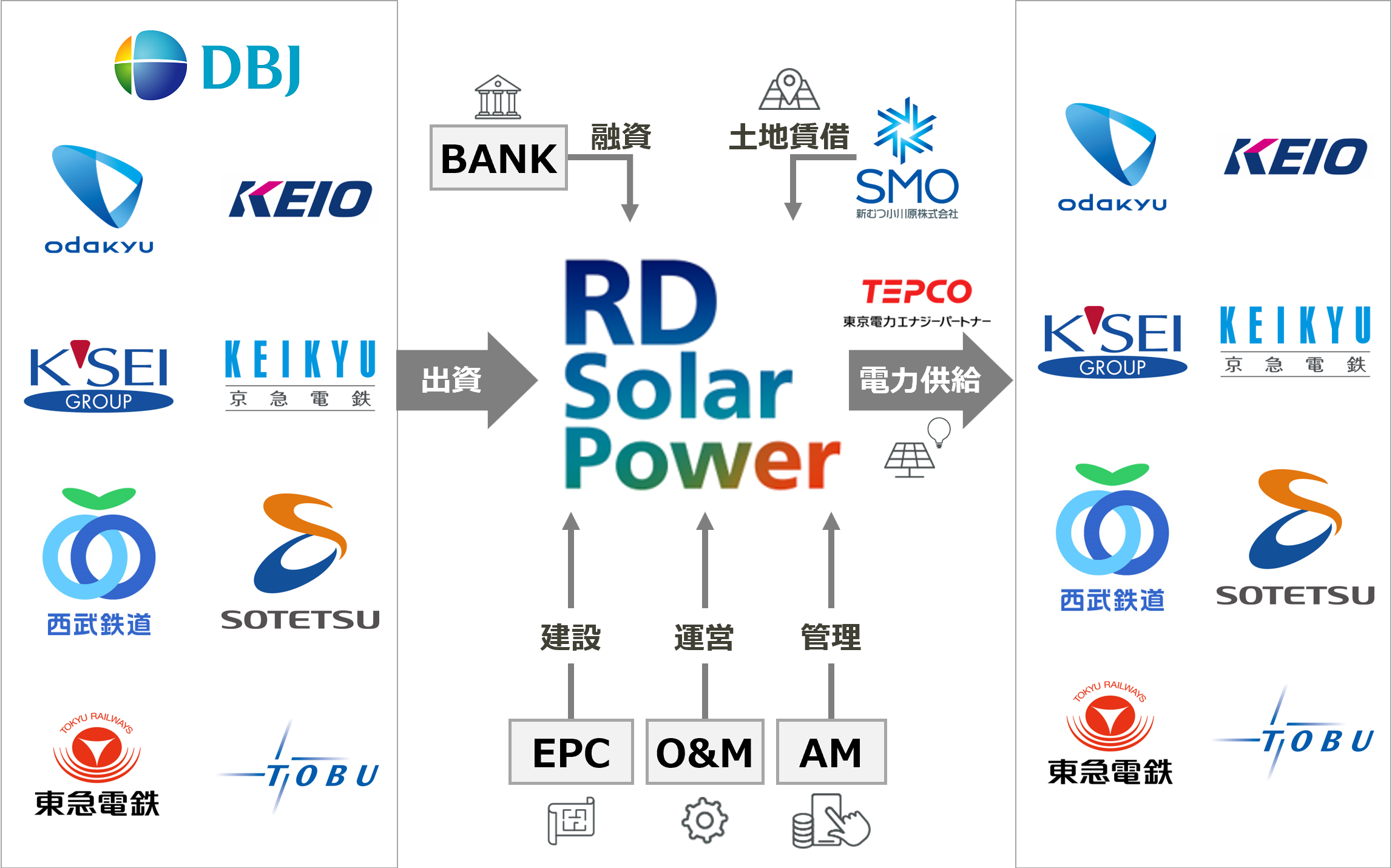 株式会社日本政策投資銀行(以下「DBJ」という。)、小田急電鉄株式会社、京王電鉄株式会社、京成電鉄株式会社、京浜急行電鉄株式会社、西武鉄道株式会社、相鉄クリーンエナジー株式会社、東急電鉄株式会社および東武鉄道株式会社(以下総称して「私鉄・グループ企業8社」という。)は、合同会社RDソーラーパワー※1(以下「RD社」という。)への出資を通じ、再生可能エネルギー事業を協働実施することとし、今般、RD社が発電所建設工事を開始するに至りましたのでお知らせします。