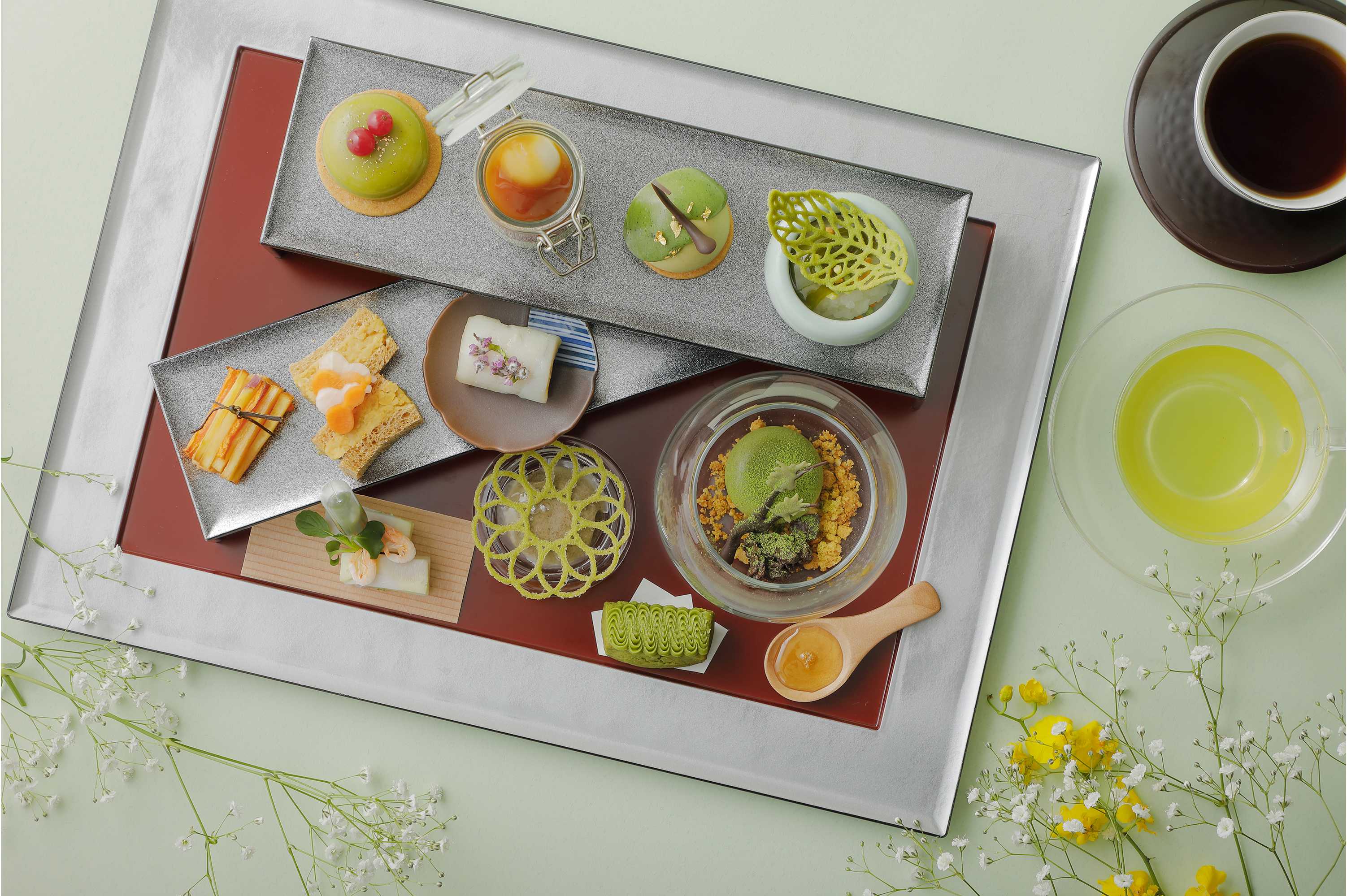 日本茶の発祥の地として知られる滋賀県の風土に着目し、豊臣兄弟への関心が高まる中、地域の歴史と日本茶を重ねたアフタヌーンティーをご用意いたします。茶の湯が文化と政治に深く結びついていた安土桃山時代を背景に据え、お茶を中心にした7種のスイーツと4種のセイボリーが並びます。スイーツは、玄米茶とオウミ木イチゴを合わせ、金箔の輝きが印象的なムースや、抹茶の濃淡で豊臣秀吉の邸宅としてなじみ深い聚楽第の庭を表現したテリーヌ、緑茶ジュレとレモンコンフィで軽やかに仕上げたリ・オレなど、お茶の特性を生かした味わいを揃えました。また、ほうじ茶チョコレートとわらび餅の組み合わせなど、異なる茶葉の香りと食感を組み合わせた品も加えました。セイボリーには、紫のグラデーションが美しい藤の花をモチーフにしたキスの小茄子ロールには、豊臣家の宴席にまつわるとされる食材を用い、城郭をイメージした里芋のテリーヌなど、歴史を感じながらお茶をお楽しみいただけます。