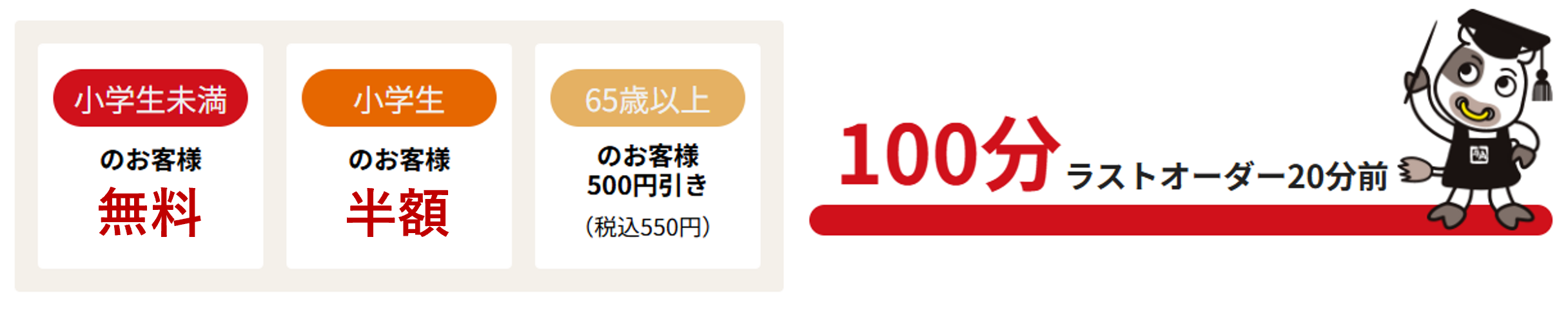 牛角で人気の「おさつバター」や「牛角冷麺」などサイドメニューも豊富に揃えた食べ放題コースが、3,180円(税込3,498円)から楽しめ、小学生未満無料、小学生半額、65歳以上500円(税込550円)引きのため、ご家族で気軽にご利用いただけます。