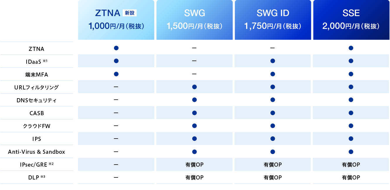 「ZTNA」プランは、VPN置き換えに必要な機能に特化することで、ZTNA機能のみを単独導入できる構成としました。初期投資を抑えながら、まずはVPN刷新から着手できます。