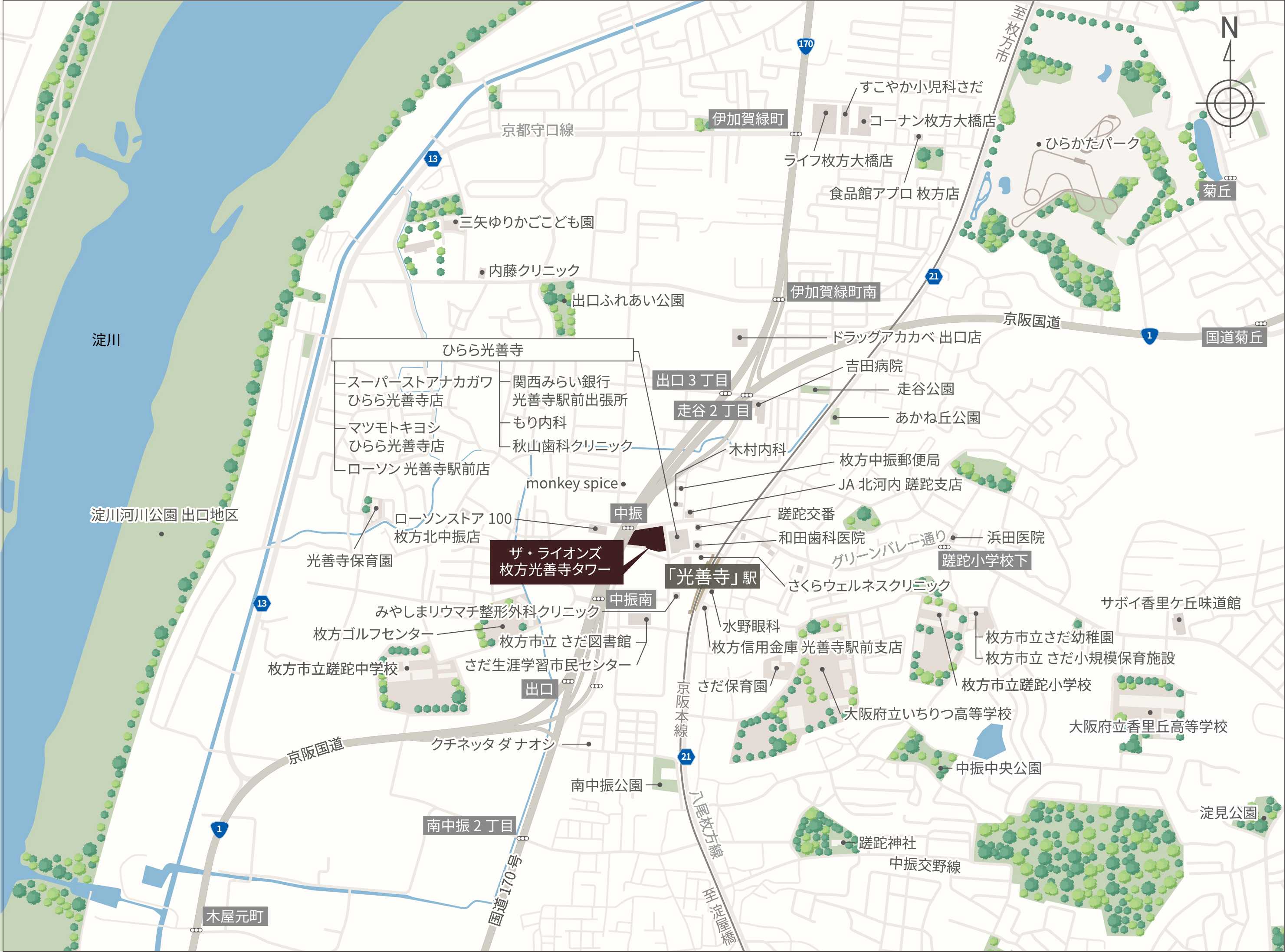本物件は、京阪本線「光善寺」駅から徒歩2分に位置し、近隣エリアの商業拠点である「枚方市」駅へ電車で約4分※4とアクセスに優れた立地です。2023年に先行して開発された商業施設「ひらら光善寺」にはスーパーやドラッグストアなどのほか、クリニック、銀行などが入店しています。周辺には保育園、小・中学校から高校までの教育機関に加え、救急病院や内科などの医療施設、郵便局、図書館がそろう利便性の高い立地です。また、広大な緑や活気ある遊園地「ひらかたパーク」へも1駅でアクセス可能です。徒歩圏内には淀川河川公園、南中振公園などの公園が点在し、豊かな自然を享受できる恵まれた住環境です。