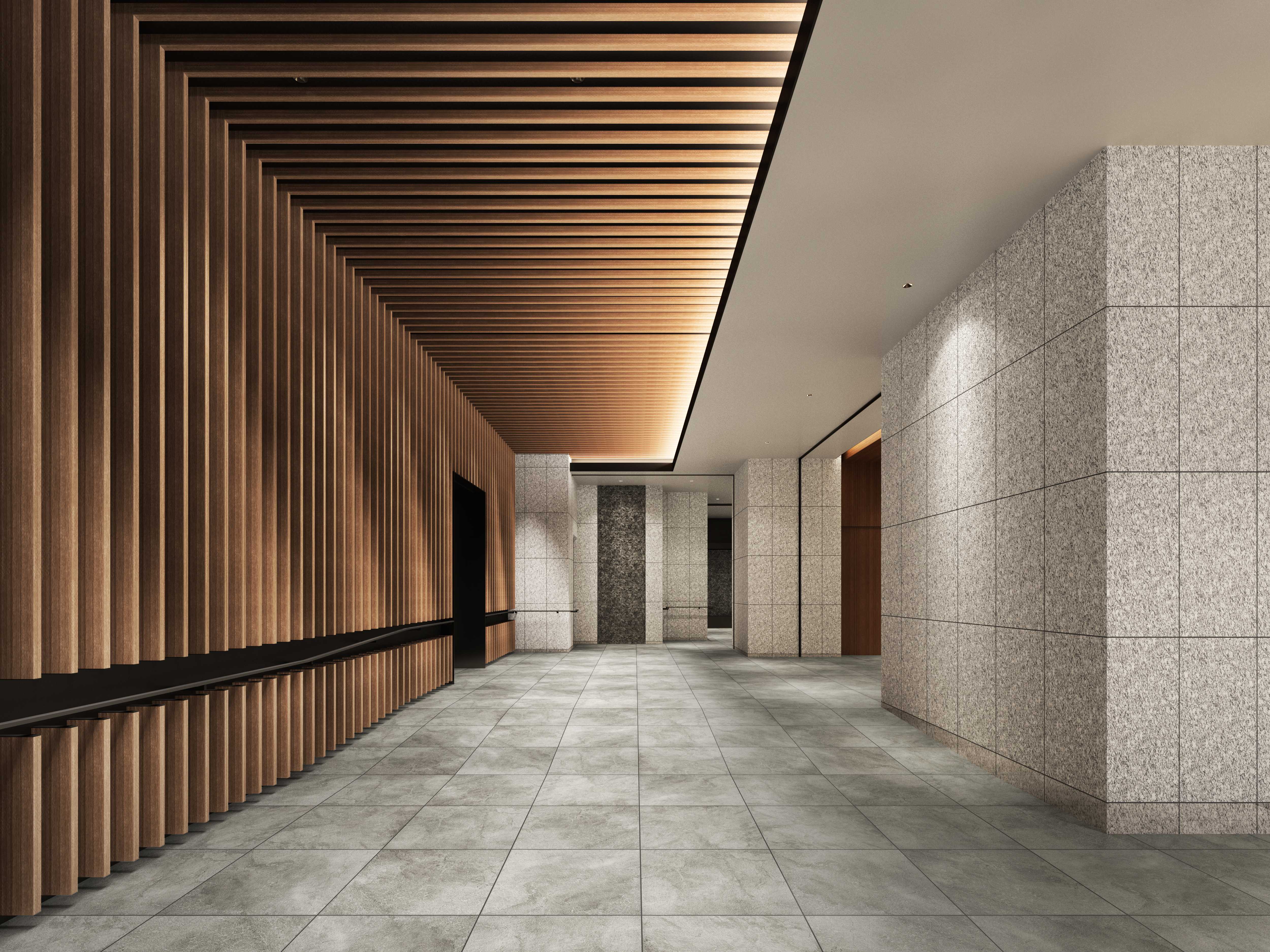 歴史と未来のクロスポイントとなるランドマークとして、建物ファサードには立体格子を取り込み、生まれ変わる街の象徴となるデザインを追求しました。エントランスには光善寺に用いられる軒垂木や石畳などをモチーフにした地域の個性を取り入れ、駅前エリアの新たな迎賓空間を演出します。高さ3.4mの開放感あるエントランスは、大開口のガラス面から降り注ぐ自然光が空間を優しく包み込み、訪れる人々を温かく迎え入れます。