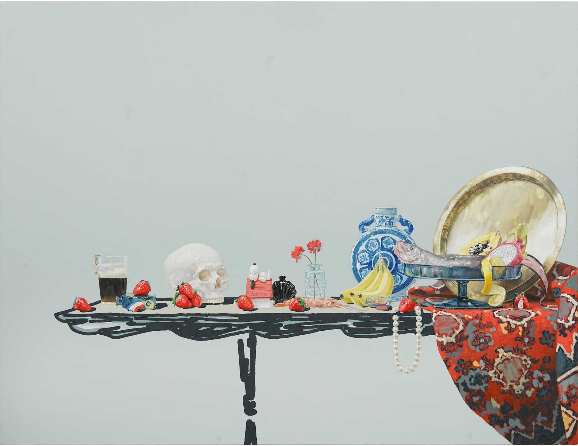 小津航《Still life with Eelpout Fish, Chinese-style Pot and Beer》1478×917×48mm, Oil on canvaswooden frame,2026年