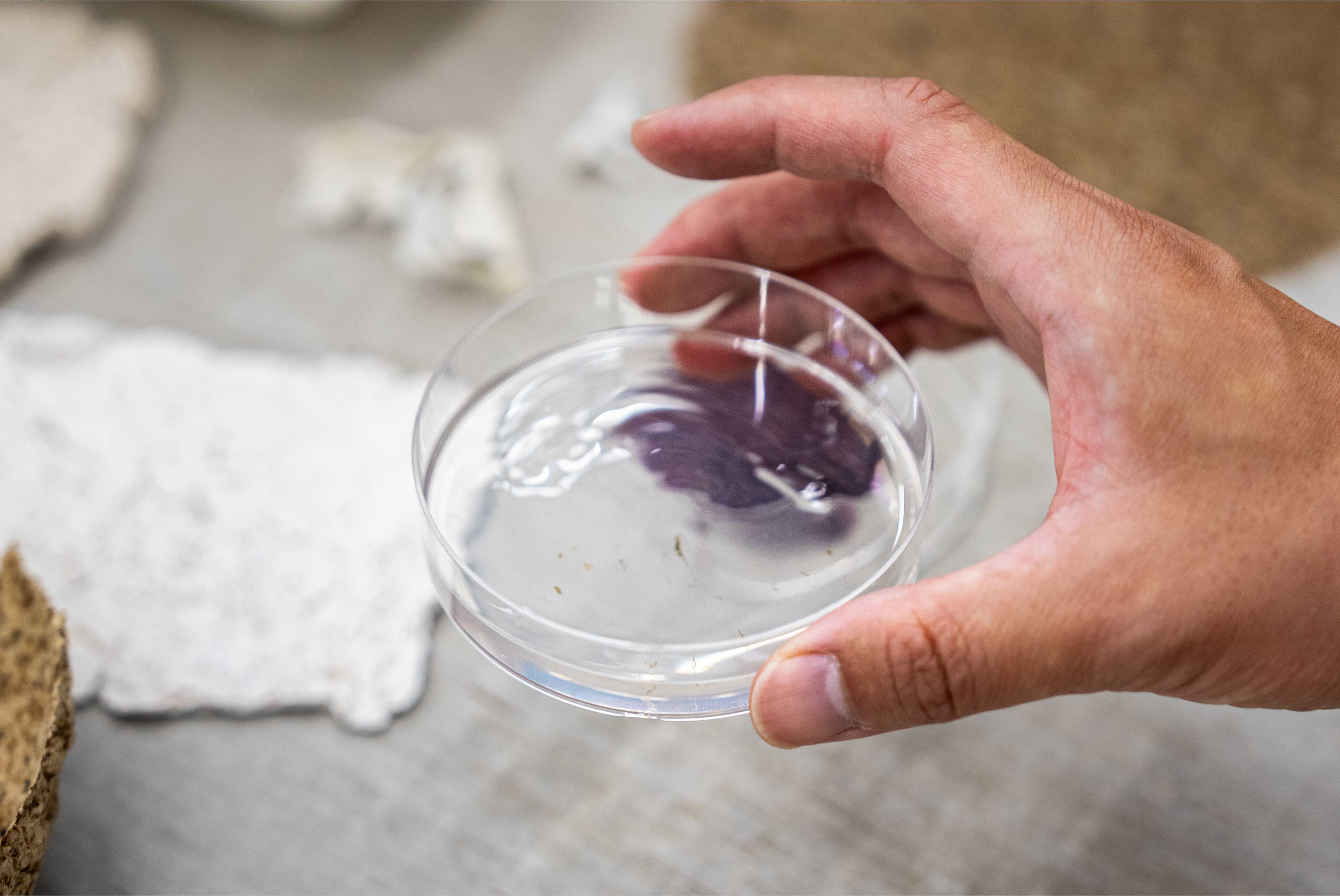 そこで、リサーチと実験に立脚した手法で新たな視点と価値をかたちにするwe+と、資源循環型イベントの実現を目指す博展は、海藻の新たな活用の可能性を探ることを目的とした、共同リサーチプロジェクトを2023年にスタートさせました。海藻の特性を探る実証実験の中で、そのヌメリ成分に着目。モズク由来のアルギン酸ナトリウムを主成分とした溶液が、木材と紙をしっかりと接着しながらも、水をかけるときれいに剥がせる特性があることを発見しました。