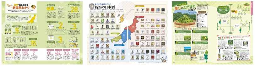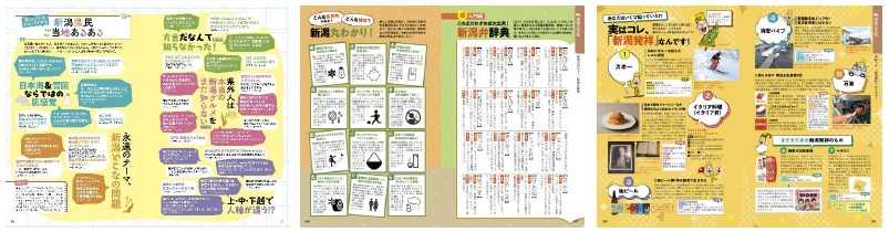歴史年表/新潟と信濃川/雪文化/北前船/新潟出身の著名人たち/新潟弁辞典 ほか ●グルメ のっぺ&わっぱ飯/村上と鮭の深い関係/へぎそば/愛しのえだまめ/半身揚げ3大巨頭/もも太郎伝説 ほか