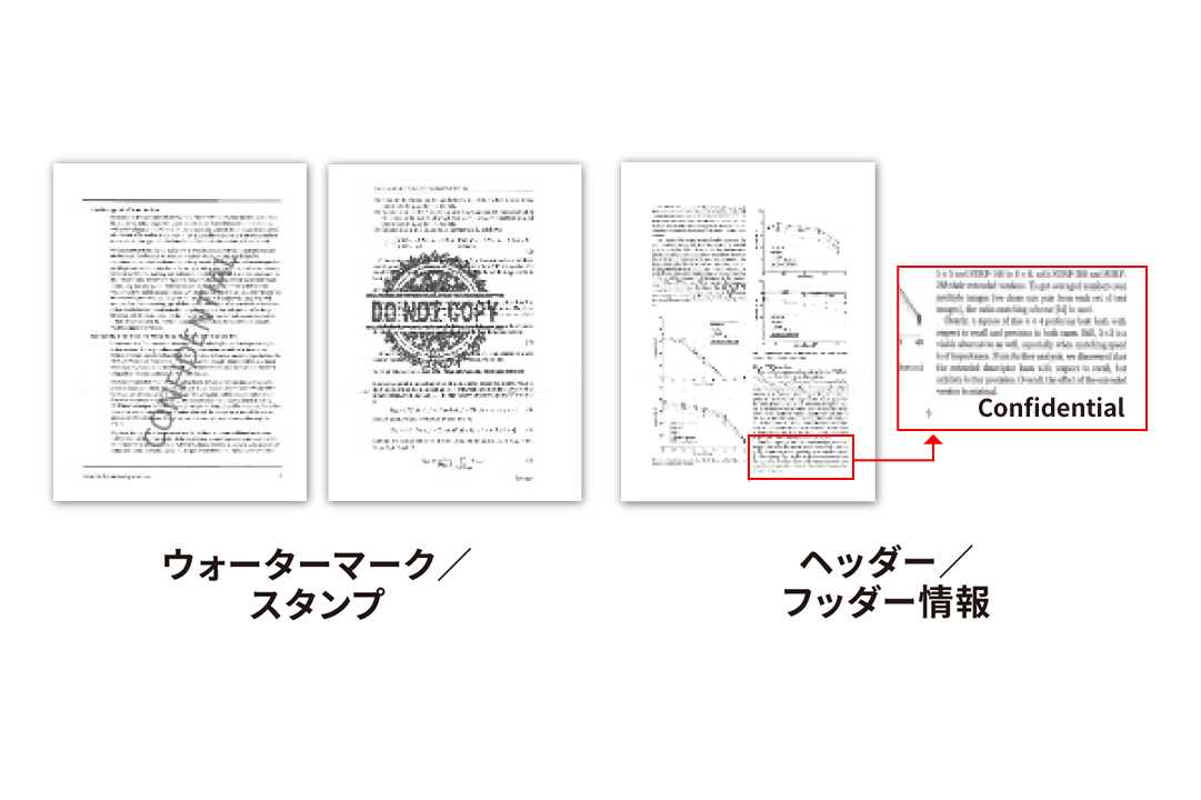 機密文書であることを示す情報(社外秘、CONFIDENTIALなど)を自動で検知して、読み込みを停止するため、データでの流出を未然に防止します。検出するスタンプやウォーターマーク、文言を事前に登録することも可能です。