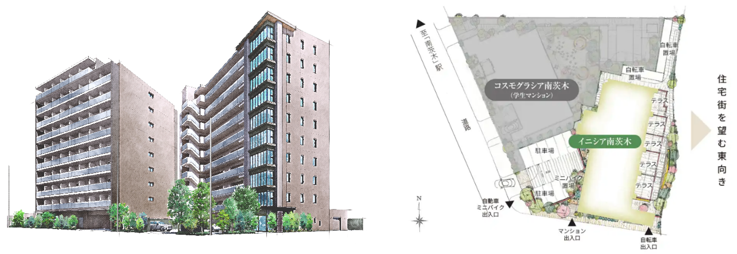 『コスモグラシア南茨木』(左)・『イニシア南茨木』(右) 完成予想図 / 敷地配置図