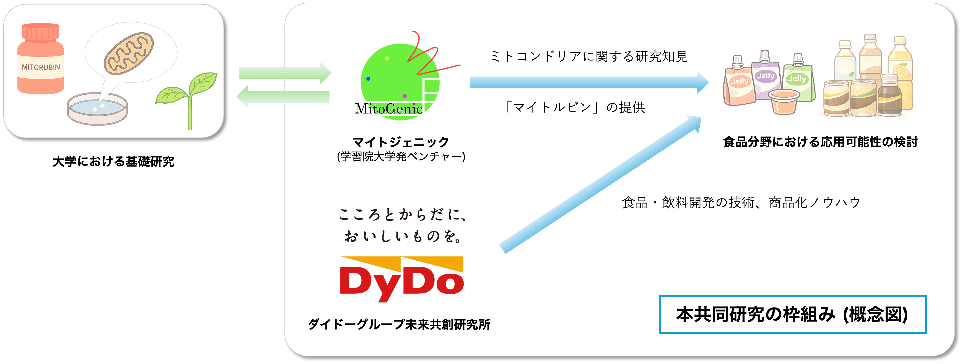 今回、人々の楽しく健やかな暮らしにつながる「こころとからだにおいしい商品の提供」のため、 “抗老化”の領域においてソリューションの創出をめざす本研究所と、ミトコンドリア研究から生まれた新成分「マイトルビン」の社会実装を進めるマイトジェニックの目的が合致したことから、新たな価値創造を実現すべく、共同研究を開始いたします。
