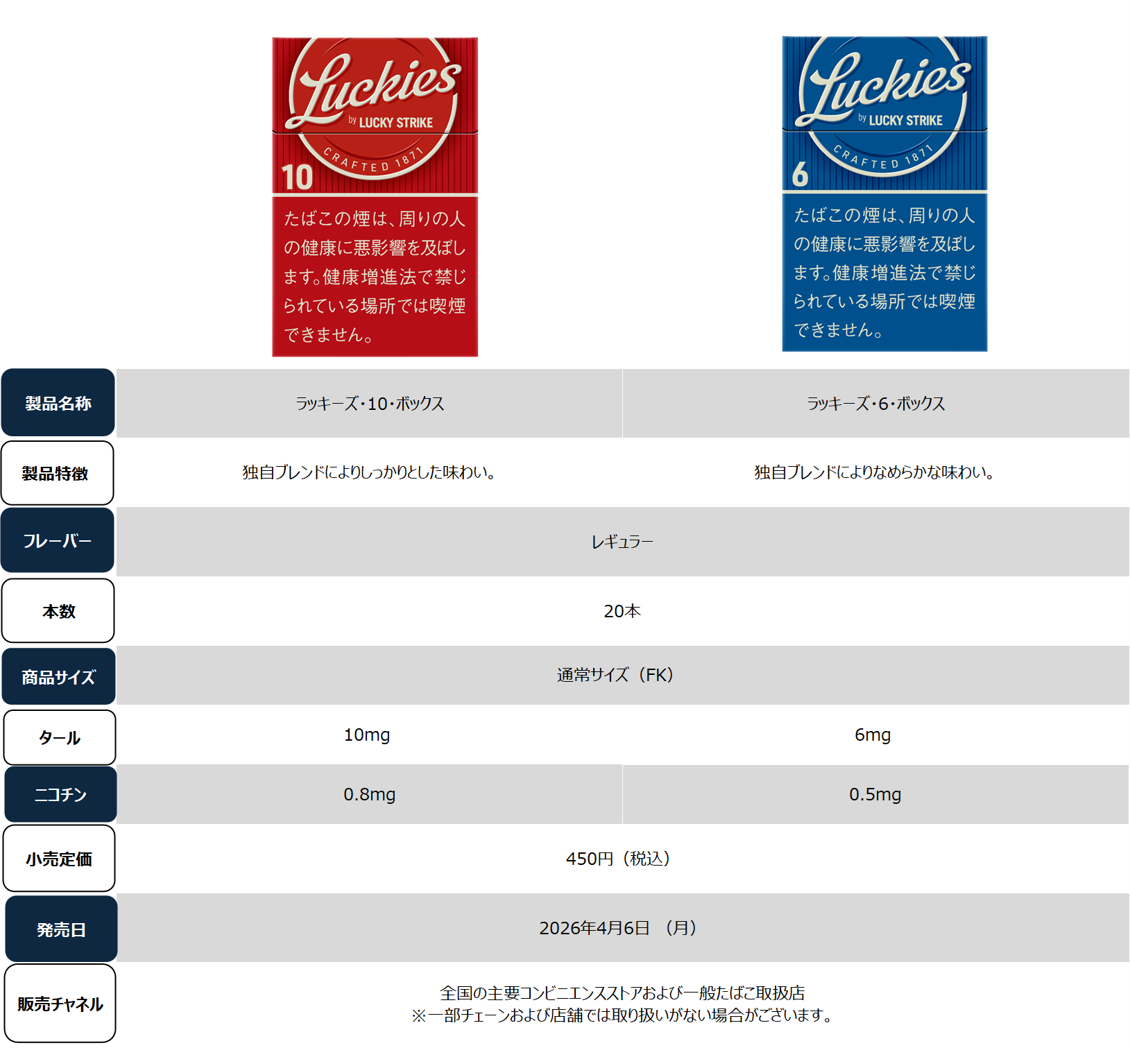 ブリティッシュ・アメリカン・タバコ・ジャパン合同会社(本社:東京都港区、代表:マウリシオ・ララ、以下「BATジャパン」)は、紙巻たばこ、ラッキー・ストライクの新シリーズ「ラッキーズ(Luckies)」から「ラッキーズ・10・ボックス」と「ラッキーズ・6・ボックス」の2銘柄を2026年4月6日より450円(税込)で全国発売します。