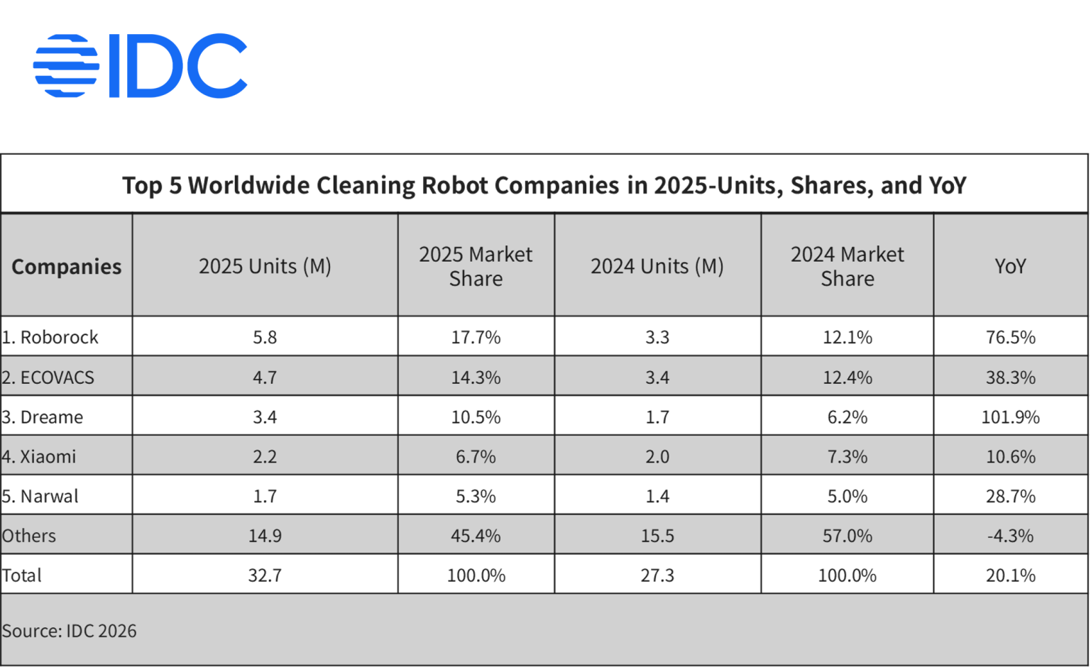 IDCによると、ロボット掃除機やロボット芝刈り機、窓拭きロボットなどの家庭用清掃ロボット市場全体において、Roborockは出荷台数(2025年:580万台)および市場シェア(17.7%)において首位を獲得しました。また、ロボット掃除機分野においては、2023年下半期以降、継続して首位を維持しており、2025年下半期には、過去最高の27.0%の市場シェアを記録し、3年連続で世界No.1ブランドとなりました。