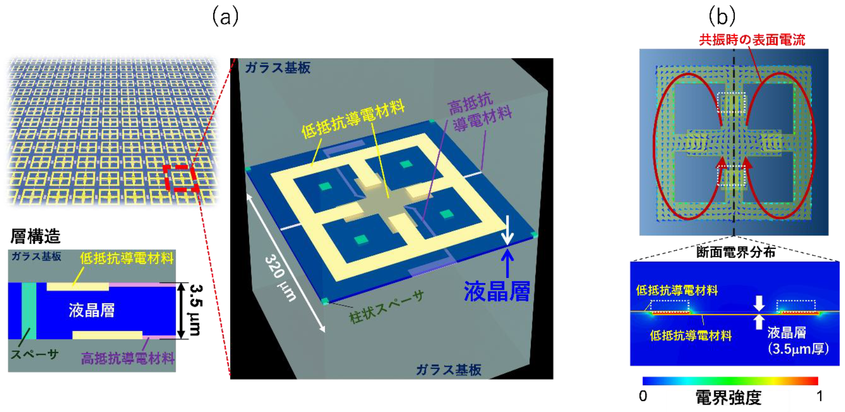図2 (a)NTT独自の液晶メタサーフェス単位セル構造 (b)共振時の表面電流と断面の局所電界分布の電磁界解析結果.液晶層が金属パターン1と金属パターン2に挟まれた層構造となっている。