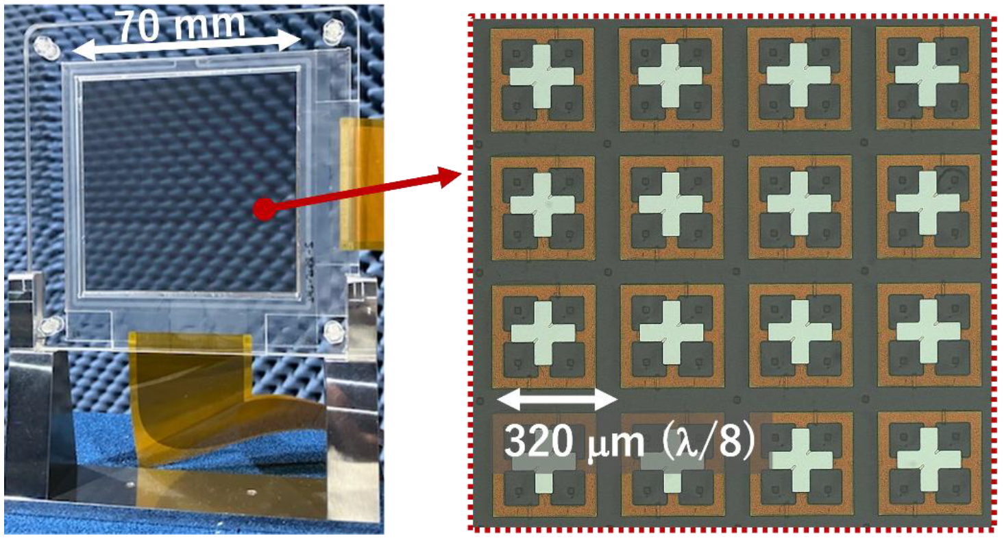 これらの技術的ポイントを採用した世界最薄の液晶層(3.5mm)を有する透過型液晶メタサーフェスをサブテラヘルツ帯(115GHz)で試作しました(図3)。