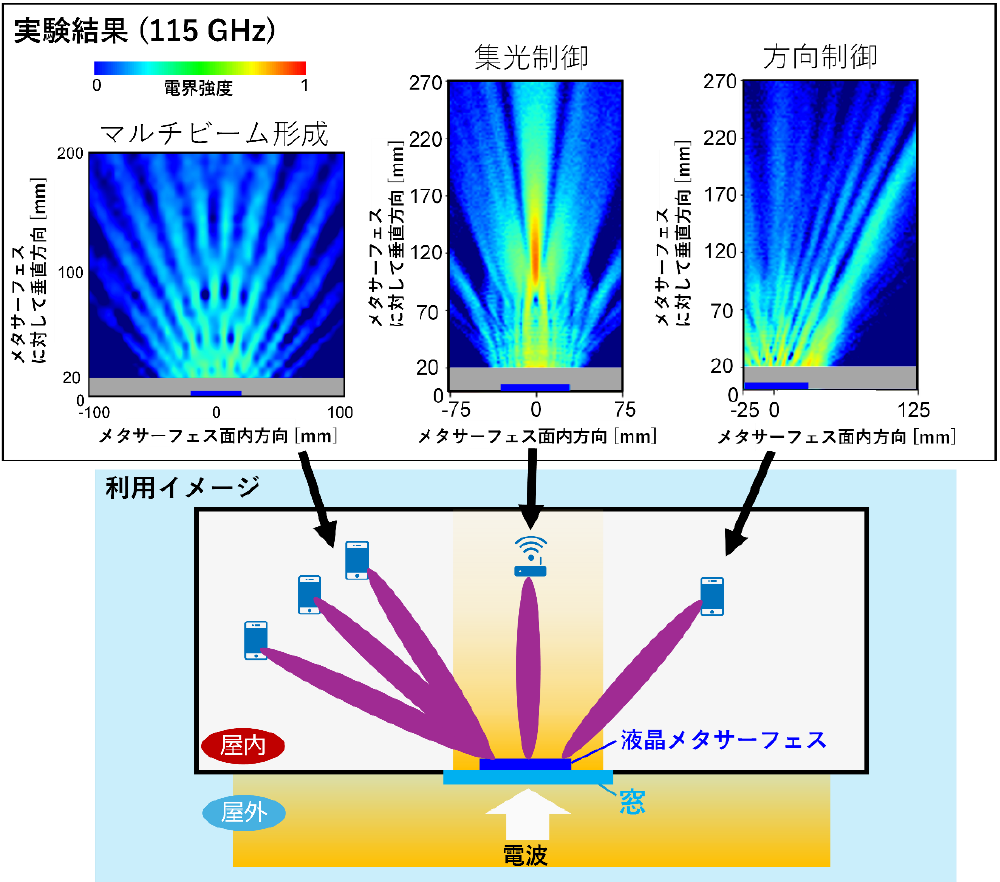 試作デバイスに対してサブテラヘルツ帯(115GHz)の電波を入射し、目的とする伝搬に応じた制御信号を入力して透過波の信号強度を評価した結果、透過波の方向および集光位置の可変制御を設計通りに実現できることを確認しました(図4)。また本構造は波長の1/8以下にすることを実現しており、これにより、従来のアレーアンテナ※7では難しい複雑なビーム形状を形成することも可能です。今回はサブテラヘルツ帯で試作しましたが、本成果は液晶厚みを周波数設計から切り離した構造であり、例えばFR3帯である10GHz帯においても同様に3.5mm厚の液晶層で液晶メタサーフェスを設計・製造可能です。将来的には図4の利用イメージに示すように、可視光に対して透明に作製することが可能な本液晶メタサーフェスデバイスを、市中の景観に影響を与えずに窓ガラス等に設置し、電波を自在に制御することが期待されます。