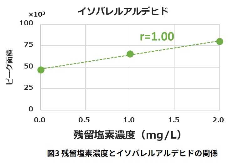 次に、イソバレルアルデヒドの生成メカニズムを特定するため、残留塩素による影響を調査をすると、残留塩素濃度の上昇に伴いブロッコリーから検出されるイソバレルアルデヒドが増加し、一方でアミノ酸の一種であるロイシンの減少が確認されました。