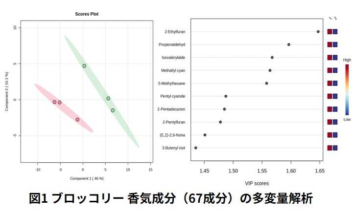 人が感じているにおいの違いを科学的に明らかにするために、におい嗅ぎGCMSで香気成分を分析し、多変量解析を行いました。その結果、水道水でブロッコリーを茹でると、浄水で茹でるときと比較して不快臭成分であるイソバレルアルデヒドが多く検出されることが判明しました 。