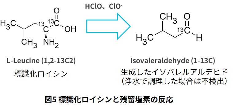 ※)を添加したブロッコリーを使って茹で調理をすると、水道水で調理した場合のみ標識化ロイシン由来のイソバレルアルデヒドが検出されました。これらの結果から、ブロッコリー中のロイシンが水道水に含まれる残留塩素と反応して、不快臭成分が生成することが示されました。