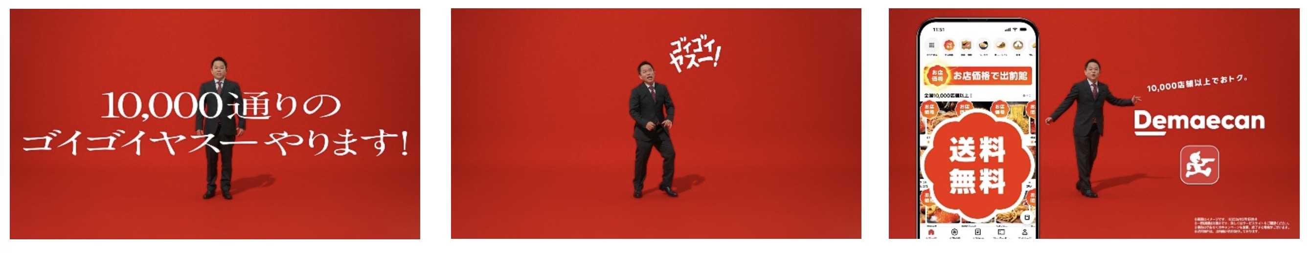 新TVCMでは、ダイアンの津田篤宏さんが赤い背景にスーツ姿で登場し、おなじみのギャグ「ゴイゴイスー」を「ゴイゴイヤスー」に変え、出前館の"安さ"を全力で届けます。