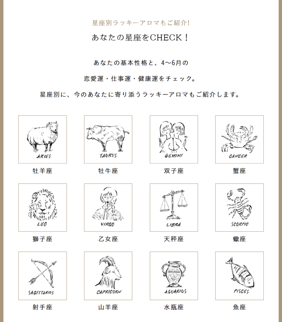 ■ 「アロマ星座占い~星が導くわたしの香り」キャンペーン ![]() キャンペーン特設サイトでは、2026年4月〜6月の運勢とラッキーアロマを星座別にご紹介。 ![]() ■ 「ラッキーアロマ作り」ワークショップ 全国のアロマテラピーショップ・スクール・サロンでキャンペーンに連動した星座別ラッキーアロマ作りのワークショップを開催。お近くの店舗をチェックして自分だけの香り作りをお楽しみください。 【開催期間】2026年4月24日(金)〜6月2日(火) 【実施場所】全国のアロマテラピーショップ・スクール・サロン 【参加費】 各実施場所・内容により異なります。 【申込方法】下記URLよりご確認ください。 https://aroma.aromakankyo.or.jp/horoscope/shoplist/ ※特設サイトから、ワークショップ実施店舗が確認できます。