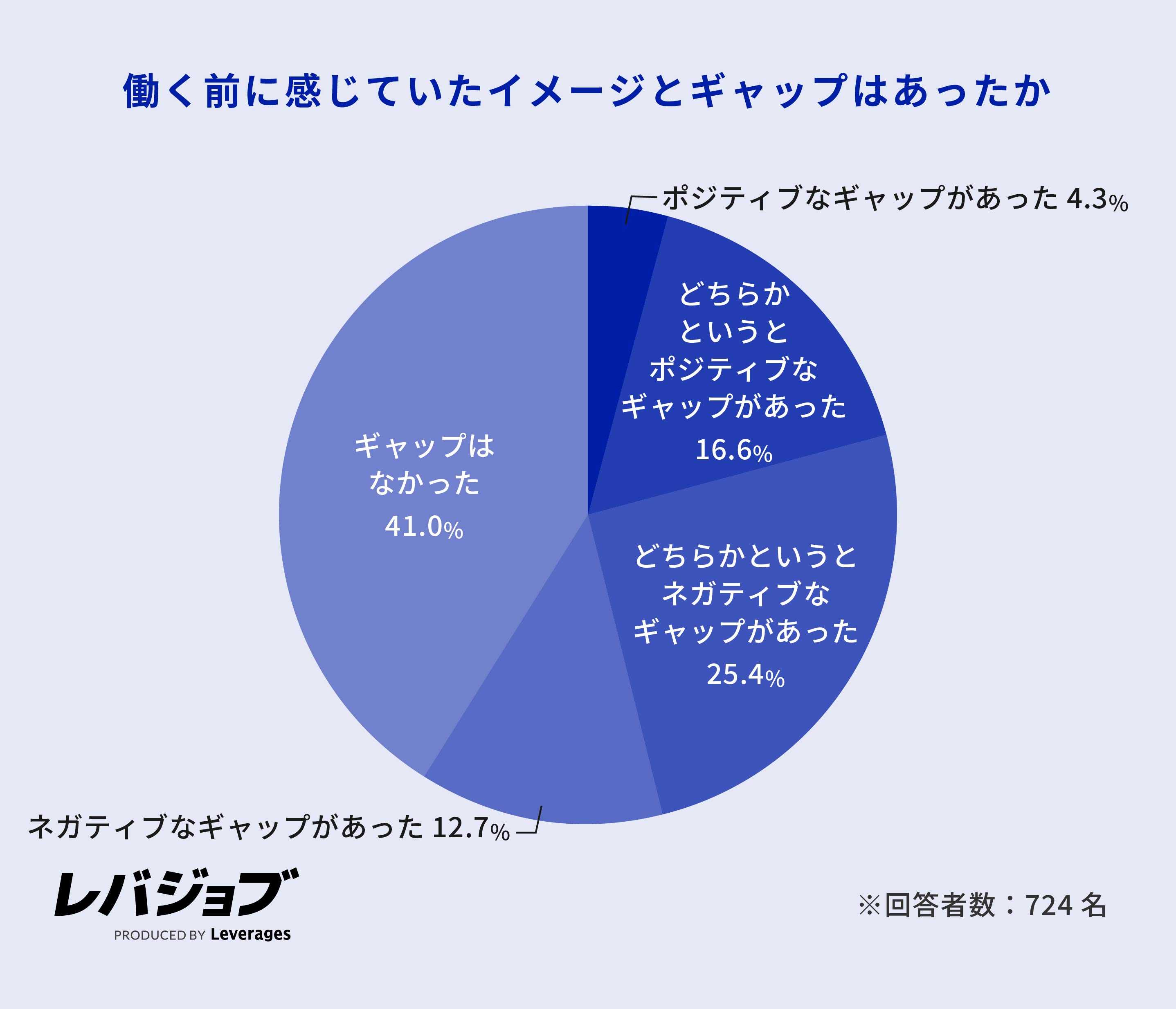 働く前に感じていたイメージとギャップがあったかを聞くと、約4割は「ギャップはなかった(41.0%)」と回答したものの、それ以外の回答においてはポジティブ・ネガティブ両方の見解に分かれる結果となりました。