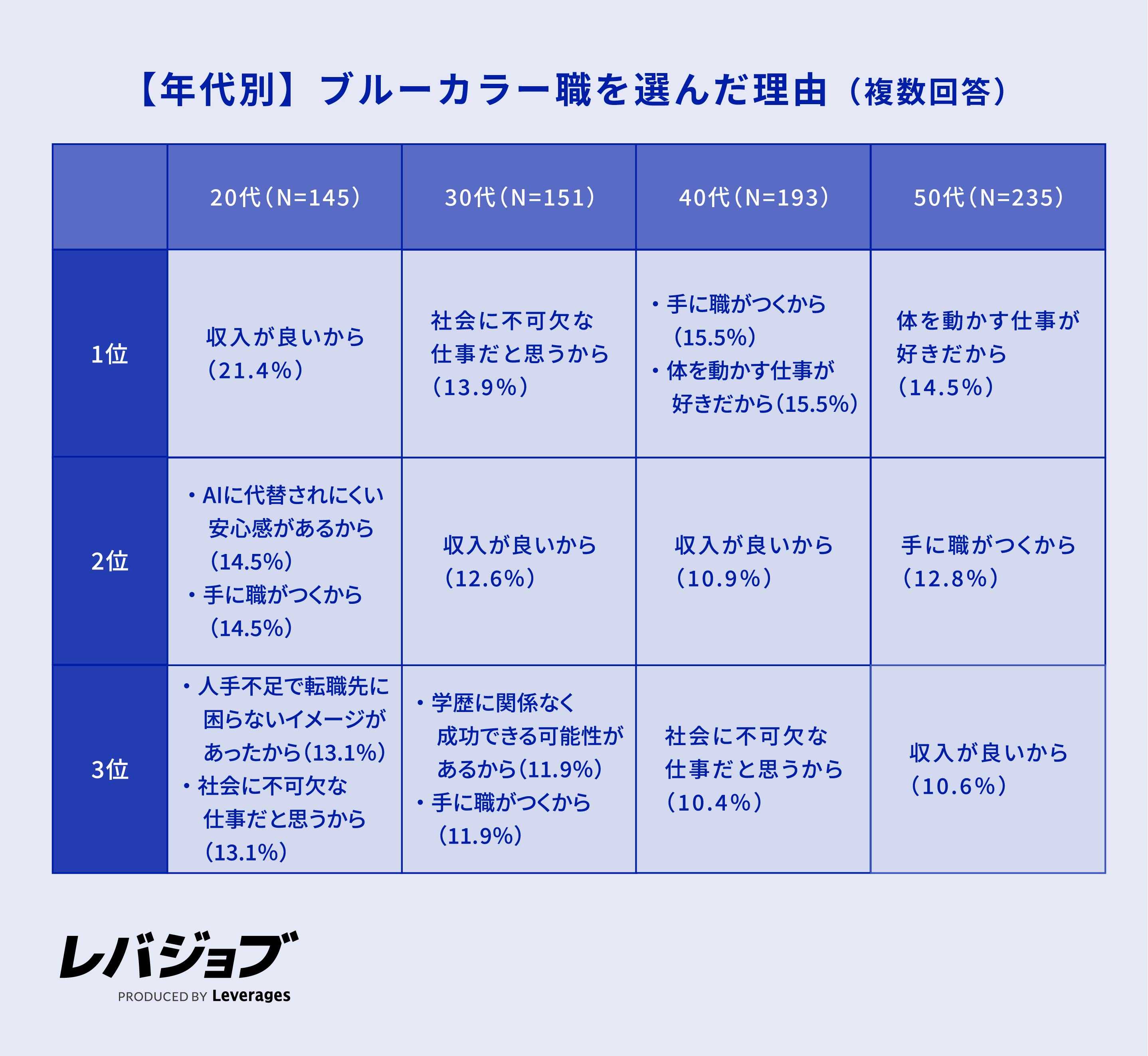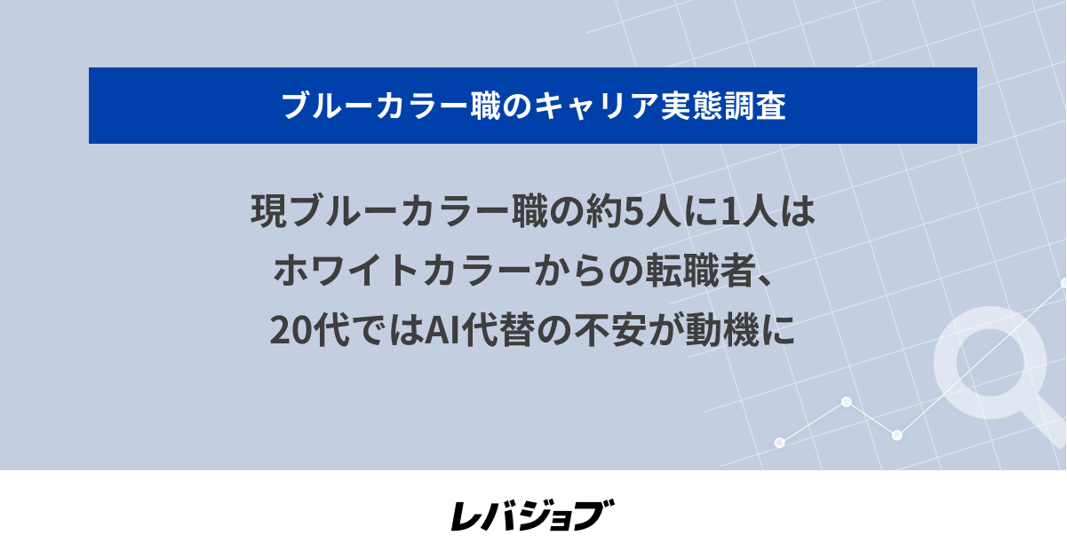 今回の調査では、現在ブルーカラー職に従事する人材の流入経路は、新卒や同職種からの転職に加え、約5人に1人がホワイトカラー職から転身していることが明らかになりました。レバジョブが2025年12月に発表した調査では、前職でホワイトカラー職に従事し、現在ブルーカラー職として働く人の約6割が、「市場での需要低下」や「AIによる代替」などを理由に不安を感じていたことが分かっており*4、こうした背景がキャリア選択に影響を与えている可能性が示唆されます。実際に、20代ではAIによる代替不安を理由にブルーカラー職を選択している人も一定数見受けられました。