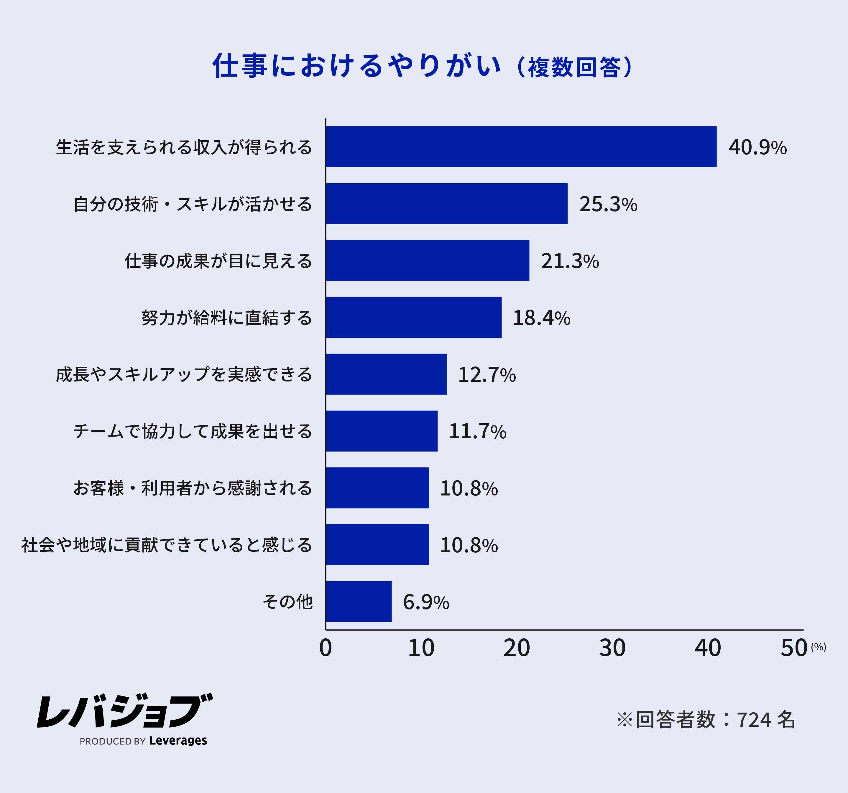 仕事のやりがいについては、「生活を支えられる収入が得られる(40.9%)」が最も多く、次いで「自分の技術・スキルが活かせる(25.3%)」「仕事の成果が目に見える(21.3%)」と続きます。