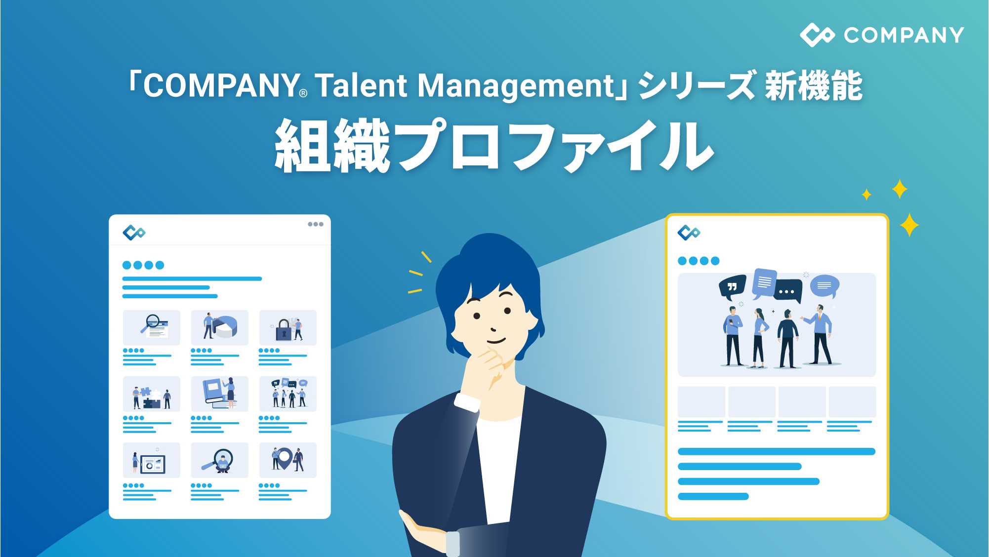 ※が利用する統合人事システム「COMPANY®」シリーズが提供する、日本法人固有の組織ニーズへ最適化したタレントマネジメントシステムです。人的資本経営に欠かせない人材の可視化、評価、育成、異動・配置、要員計画といったあらゆる機能を網羅しています。HR特化型生成AIの搭載と、現場の従業員から経営層までが迷わず操作できるUI/UXにより、はたらくすべての人が活用できる「COMPANY® Talent Management」シリーズとして、組織の意思決定と個人の成長を同時に加速させます。