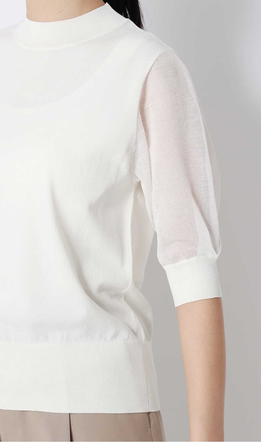 商品の身頃部分は、細い糸を高密度に編み立てることで表面の凹凸を抑え、滑らかで柔らかな肌触りに仕上げています。デザインは、気になる二の腕をさりげなく隠せる5分袖に加え、襟元は少し詰まり気味のハイネック仕様にすることで、首周りをすっきり見せつつきちんとした印象に。さらに、自宅の洗濯機で洗えるマシンウォッシャブルや、毛玉になりにくい抗ピリング素材を採用しているため、イージーケア性にも優れています。暑い夏に向けて、気軽にトレンドを取り入れながら一枚でも透けを気にせず着用できるアイテムです。