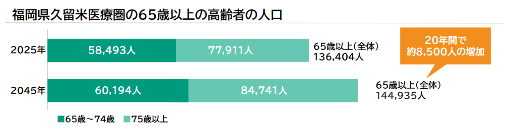 日本医師会によると、福岡県久留米市とその近隣を含む久留米医療圏(※2)では、今後20年間で65歳以上の高齢者が約8,500人増加し、2045年には約14万5,000人となると推計されています(※3) 。 これに伴い介護ニーズも深刻化し、2050年の介護需要予測指数は2020年比で26%増となる見込みです(※3) 。