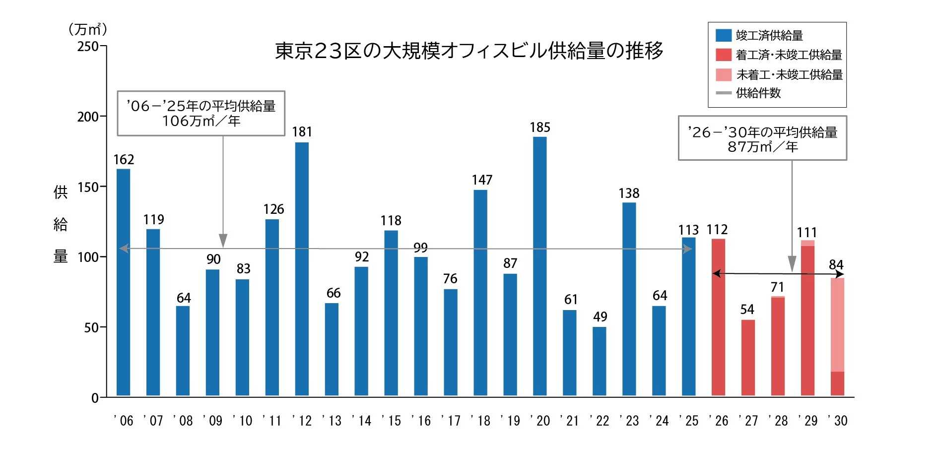 26年以降の5年間では、26年・29年は25年と同程度の供給が見込まれる一方、今後5年間の平均供給量は87万㎡(過去20年間の平均比77%)に留まる見込みです。