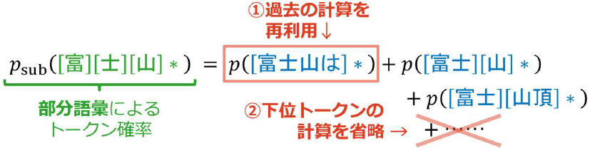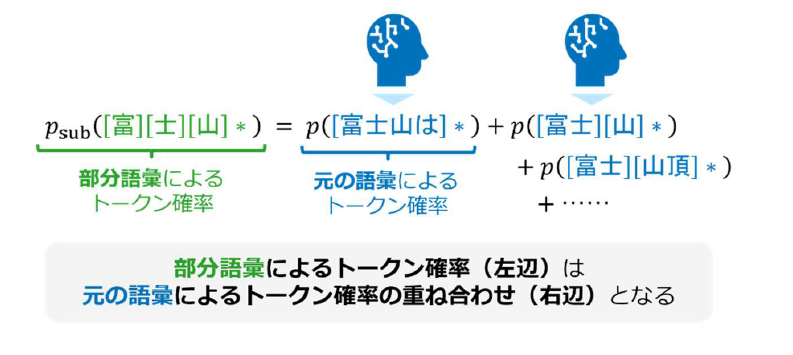 図3 出力される文章が変化しないために要請される、元の語彙と部分語彙に関するトークン確率の関係式(イメージ)