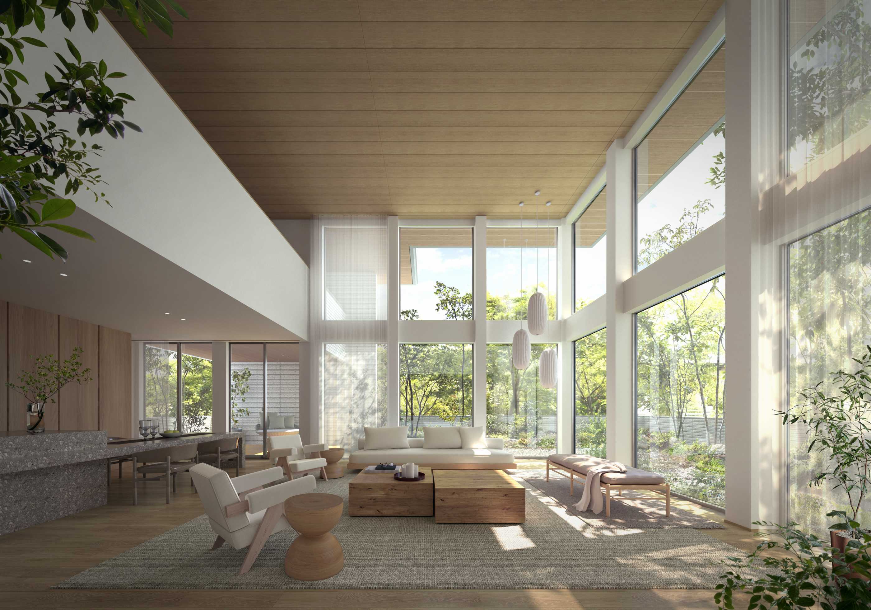 2.大空間リビングに広がる最大幅約6mの吹き抜けと大開口で開放感あふれる住まいを演出