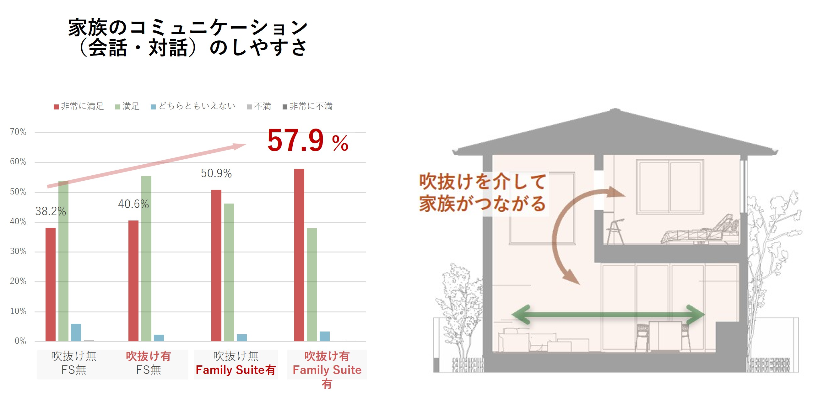 当社の研究機関である総合住宅研究所の調査によると、吹き抜けを備えた住まいでは、家全体で家族の気配を感じることができ、家族のコミュニケーションのしやすさが大きく向上することが確認されています。