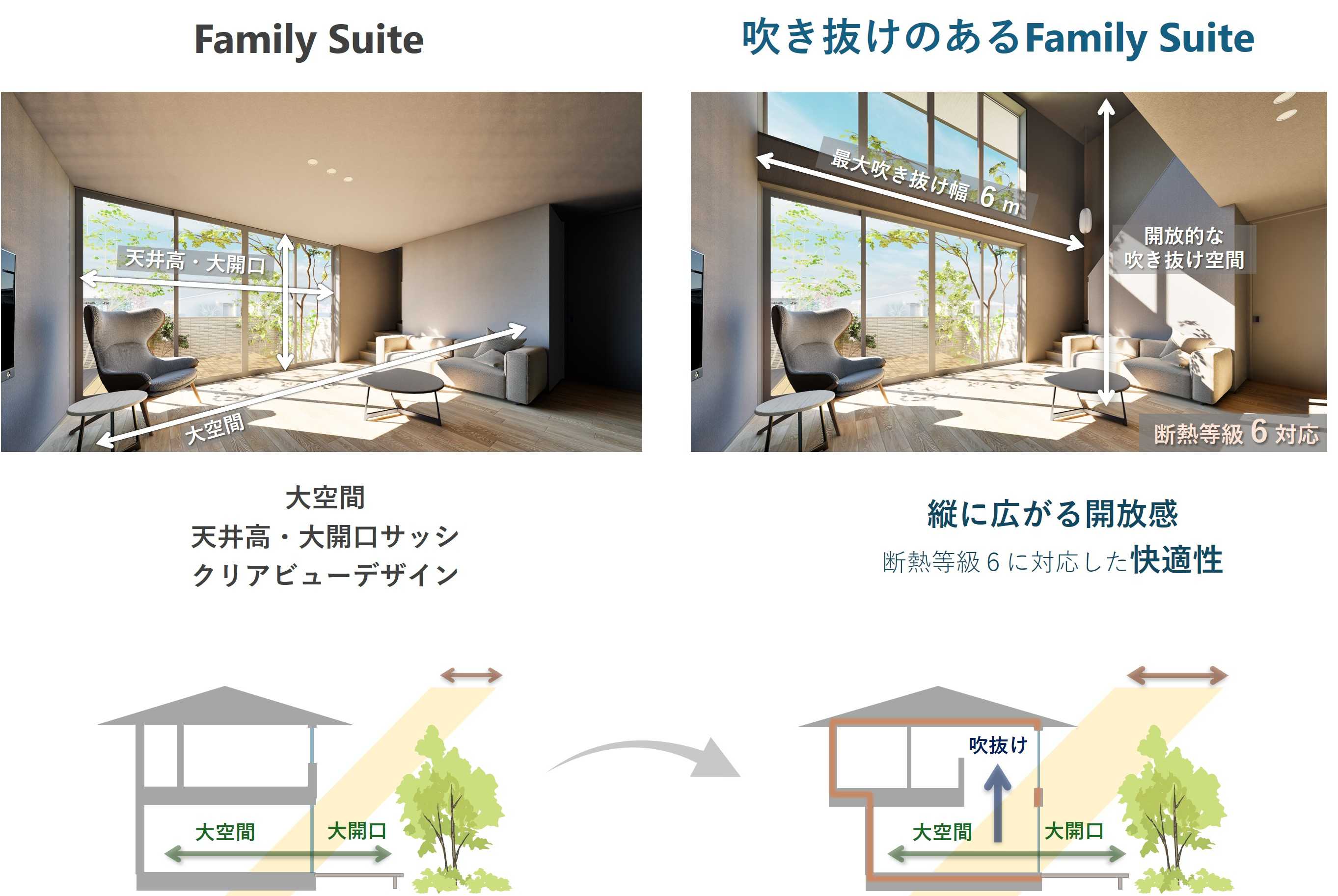 今回の「ファミリー スイート」は、従来の縦・横に広がる大空間に、最大幅約6mの吹き抜け空間と大開口を採用することで、より立体的なリビングを創出します。また、断熱等級6に対応*¹した高断熱仕様により、外からの暑さや寒さを防ぎ、室内温度が安定することで、年間を通して快適な暮らしを叶えます。新たな「ファミリー スイート」は、家族との心理的・物理的つながりと、吹き抜け・大開口による快適さの両方を兼ね揃えた住まいを実現します。